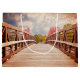 En stor presentväska med ett scenfotografi. En träbro som leder till en bana omgiven av att träd byter färg.