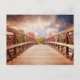 Ett vykort med en scenisk tittar träbro som leder in i en bana omgiven av att träd byter färg.