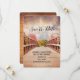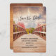 Bröllop spara datum-kort med en scenisk tittar träbro som leder in i en bana omgiven av att träd byter färg.