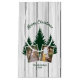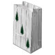 Rustic holiday gift bag with gray wood background and dark green trees. Photo templates via Pixabay licensed under CC0 and must be replaced with your own photo