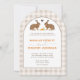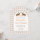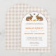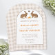 This wedding invitation features Destei's beige gingham background paired with a watercolor illustration of two hares facing one another with a small brown heart and three carrots placed between them. A rounded white arch with a brown border frames the design and creates a clear space for your wedding details.