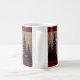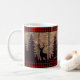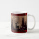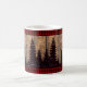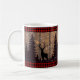 Rustic Woodland Hjort Mugg med anpassningsbar, rustik träbakgrund och rödbuffel la mönster ovanpå och grund i glaset. Det här är perfektens mugg plan för en vinterscen.