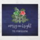 Rustic and whimsical red and green holiday mushrooms, woodland greenery and dark navy blue wood.