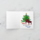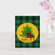 Rustika vikta julkort med motiv av älg och julgran, anpassat familjenamn och personliga signaturer understrukna med grönt och svart karljohansmönster.