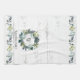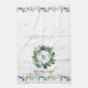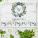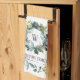 Den här personligen är en torr kökshandduk med en handmålad vattenfärgad krans av grönaktiga lagrar med en monograminledning i mitten mot bakgrund av vitt och grått barrträ. Nedan är din familj namn och gräns av botaniska löv. Från våra hjärtan till era, njut!