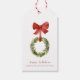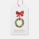 En rustik röd märkre för kransens helgdag. Den här julklappen har en boxwood greenery christmas-krans med röd båge. All text kan anpassas med valfri ordalydelse.
