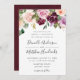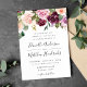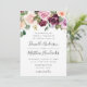 Elegantens bröllopsinbjudningar för blommigt som innehåller dina detaljer i moderna kalligrafskript under en gräns av vattenfärgsfärgade rosor och grönt i nyanser av , persikor, lila, burgundi och grönt. Inbjudan återgår till en grumlig vattenfärgsbakgrund. Perfekt till vår, sommar- och fallbröllop!