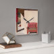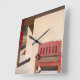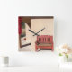 En primitiv röd bänk mot en stuckvägg i solsken. En sträng chilipaprika, som kallas ristra, finns också på fotot den här klockan.