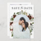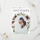 Den här fina spara-the-date-designen har vattenfärgsfärg, rosa blommigt, masala, eucalyptus och ett foto på en båge. Du kan anpassa informationen och lägga till mer på baksidan om det behövs. Visa samlingen på den här sidan om du vill söka efter fler matchande objekt.