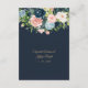 Detaljkort för rustikt akvarell marinrosa guldblommig bröllop. Bukett med marinblå och rosablommor med guldfärgade accenter