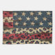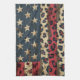 Nedsliten amerikansk flagga med djärvt leopardtryck överlagt på rustik trästruktur. Perfekt för patriotiska kvinnor, de som älskar country-stil och de som älskar djärva USA-inspirerade kökshanddukar.
