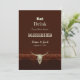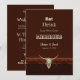 Lantlig västern cowboy äta dricka gift rolig brun trä bryllopsannons. Rustik tjur skalle. Använd lite humor med dessa söta, roliga lantliga stil inbjudningar. Ät, drick, för vi gifter oss kan anpassas. Trendigt, gammalt vilda västern vintage antik stil design. Cool gård djur. Anpassa skrift och typografi. Bild copyright Marg Seregelyi Photography.