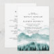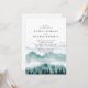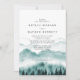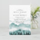 Elegant och rustik bröllopsinbjudan med akvarellberg med träd och brudens och brudgummens initialer på baksidan med bröllopsdetaljer.