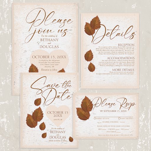 Fira din hömälskeshistoria med detta eleganta rustika svarsbrev som har en vacker strukturerad björkbarksbakgrund med en mjukt utskuren hjärtdetalj, prydd med rik varmtonad höstflora. Den svepande kalligrafiska skriften i kombination med klassisk seriftext skapar en tidlös men säsongsbetonad känsla, perfekt för ett oktober- eller höstskogsbröllop.