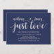 Denna rustic marinblå (alla färger kan anpassas) bröllop elopement-inbjudan är perfekt för din bröllopsfest och efterbröllopsfirande. Lägg till dina uppgifter med matchande teckensnitt.