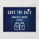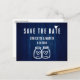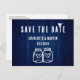 Minimalistiskt rustikt bröllop spara datum postkort med modern kalligrafi idealiskt för en marinblå rustik lantbröllop/bakgård/lada bröllopsfest.