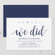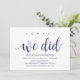 Ja, det gjorde vi, bröllopsinbjudan till mottagning efter bröllopsflykt. Detta rustika blåa (du kan anpassa alla färger) bröllopsinbjudningskort med tema bröllopsflykt är perfekt för din bröllopsmottagning och efterfest. Lägg till dina detaljer i matchande teckensnitt / bokstäver.