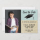 Modern och rustik blå examenshögtids-inbjudan "Save the Date" med foto. Modern inbjudan för att tillkännage examensfesten för din examenstagare. Kortet är i blå och beige rustik textur och innehåller en examensmössa. Designen har trendig text - anpassa all text på kortet med dina uppgifter, och en fotomall - infoga examenstagares foto i mallen. Ändra datum och annan text på baksidan av kortet.