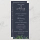 Rustik akvarell skogsflora, marinblå bröllopsprogram. Programmet har flera rader för anpassade textlistor för ceremonieordning, bröllopsfest och tacknota.