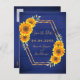 En rustik landsbygd stil Save the Date-kort. En förgylld ram med gula och orange solrosor. Personifiera och lägg till era namn och datum för bröllopet. En marinblå rustik trälads vägg som bakgrund. Gyllene bokstäver. Namnen skrivs med en modern handskriven stilsnack.