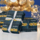 Pappa in presenterna till bruden och brudgummen med en rulle Rustik Blå Solros Bröllopspresentpapper. Pappersdesignen har en rustik trähylla med en elegant bukett solrosor. Ytterligare bröllopspapper och presenter finns tillgängliga med samma design.