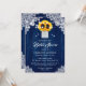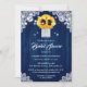 Komplettera din rustika blåa bröllopsfest med dessa eleganta blommiga bröllopsinbjudningar med en solrosbukett i en masonburk på en bakgrund av lada trä som är prydd med strängljus och delikat blomster spets.
