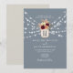 Fira din speciella dag med denna rustika dammiga blå bröllopsinbjudan med lysande strängljus, burgunderröda och rosafärgade akvarellblommor och ett romantiskt monogram i murarvas. Perfekt för landsbygd eller lada bröllop med en charmig vintage twist.