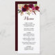 Bohemian stil bröllop-menykort med vattenfärgstryck som illustrerar burguner, rött och rosa och ro med fjädrar accent. Matchande objekt är också tillgängliga. Klicka på knappen "Anpassa" för att ändra typsnitt, storlek och färg.