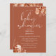 En elegant, en snyggt babyduschinbjudan med elegant, typografi och söt botaniskt harts på en terrakotta bakgrund. Designad av Thisisnotme©