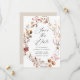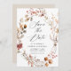 Elegantens falltema sparar datumet med vattenfärgade höstblommor och löv i röda, oliv grönt, orange och bruna nyanser. "Spara datumet" visas i ett modernt kalligrafiskript med information om namn och bröllop som visas nedan. Fallkoordinaterna sparas med blommigten Rustic Autumn Blommigt bröllop.