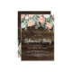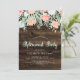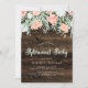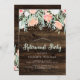 De rustiska och trendig partiinbjudningarna från pension har blommor och löv i mjuka nyanser av rosa, persikor, vit och blå färg, med en modern accent från Faux guld, på en brun träbakgrund.