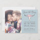 Skicka den här eleganten det roliga temat bröllop spara datum-fotoannonsering till familj och vänner för att meddela din bröllop-förlovning. Den moderna boho-inspirerade designmallen innehåller ditt foto på den lämnat och till högerna är en handmålad skalle med en blommigt för vattenfärg i rosa på en bakgrund av blått grått-vävat trä. Ovanför koskallen står det "Spara datum" och nedan är ditt namn och bröllop-datum i svart manustypografi för att anpassa sig. Kortets baksida har en matchande faux wood struktur. Gratulerar på din förlovning! Designad av konstnären Susan Coffey.