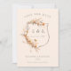 Ett vackert klassiskt bröllop spara datum-meddelande med en falltapp med en vapensköld med en handskisserad sköld, försedd med en vattenfärg terracotta persikoblommor och löv, med ditt monogram och bröllop-datum i grått i mitten på neutraltens bakgrund. Anpassa ytterligare med namn, bröllop och foto på motsatt sida.