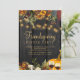 Vackra rostiga orange och mörka burgunderfärgade höstblommor och pumpaborders med kedjor av gyllene glödljus över en mörkbrun lada i trä som bakgrund, bildar en charmig inbjudan till Thanksgiving-vänner middag med trendig, handskriven guldtypsnitt. +++++++++ Lätt att anpassa med dina detaljer! Lämpar sig för traditionella rustika lantgårdshus, utomhus, bakgård, familje- och vännernas sammankomster. Digital nedladdning tillgänglig