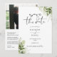 Denna eleganta botaniska grönska blad rädda datum inbjudan kan anpassas med din information i chic typografi med ditt speciella foto och bröllopswebbplats QR-kod och detaljer på baksidan. Designad av Thisisnotme©