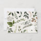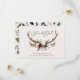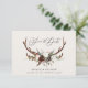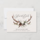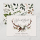 Rustik bladverk, blommor och hjorthorn bröllop spara datum kort. Med vacker akvarell bladverk, vita blommor, trä skiva och handskriven skrift. Denna moderna inbjudan kommer säkert att sätta stilen för din kommande fest.