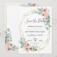 Detta moderna eleganta save the date-kort har en gyllene geometrisk ram utsmyckad med vacker akvarell mjuk rosa blomster och grå eukalyptus. Designad för att matcha vår bröllopssamling Cherise. Anpassa det enkelt och snabbt med dina detaljer, tryck bara på knappen Anpassa för att ytterligare ändra och formatera stil och placering av texten. (c) The Happy Cat Studio