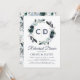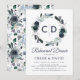 Eleganta bröllopsinbjudningar med en chic vit bakgrund som kan ändras till valfri färg, en rustik marinblå akvarell blommig kransdesign, parets initialer och en modern textmall som är lätt att anpassa.