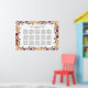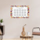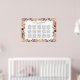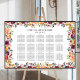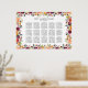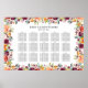 Stilfull bröllopsplatskarta affischdesign med en monogram av brudens och brudgummens namn och bröllopsdatum, anpassad malltext för bordnummer och gästers namn ramad av en kant av sommar- och höstvattenfärg blommor, inklusive rosor, dahlior, pionblommor och grönska, i en fantastisk höstpalett av burgunderrött, gyllengult, persikorans, rosablush och olika gröna nyanser.