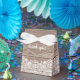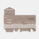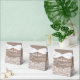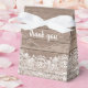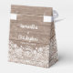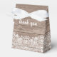 Planerar du ett rustikt bröllop i en ladugård? Här är den perfekta presentpåsen att fylla för dina gäster. Ljust brun trästruktur med en bred vit spetskant längst ner. En snygg vit rosett högst upp balanserar designen. Tack står skrivet på främre klaffen i ett ljust vitt skrivstil. Samma teckensnitt används på baksidan för namnen på bröllopsparet.