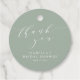 Denna bröllopsdusch-favorit-tagg har mjuka, gröna nyanser med elegant, script-bokstäver för en lugn, modern utseende. Framsidans design kombinerar ett graciöst tackmeddelande med personliga detaljer, medan baksidan visar ett delikat botaniskt linjemönster för en genomtänkt avslutande touch. Anpassa namn och datum för att matcha din fest. Perfekt för att knytas på påsfavoriter, presentlådor, flaskor eller välkomstpresenter och utformad för att samordna sömlöst med matchande bröllopsdusch-papper och dekorationer.