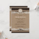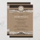 Bröllopsdusch-inbjudningar i säckväv och spets med en rustik design med en över- och underkant med utsmyckad ram och ett monogram högst upp, samt illustrerad spets från båda, över en tryckt design med säckvävstruktur. Informationen om er dusch är personlig under ett texturerat lager för att texten ska se ut som om den är tryckt direkt på säckväv.