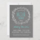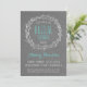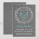 Rustik bröllopsfestinbjudan i grått och turkos med vit krans och teckensnitt. Du kan ändra teckensnittets färg, så om du gillar den här designen och din bröllopsfärg är korall eller turkos eller röd, kan du ändra färgen för att matcha. Om du också behöver skriva mer, som en dikt eller anvisningar eller överraskningsinformation, kan du lägga till text på baksidan av kortet utan extra kostnad.