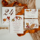 Vår bröllopsinbjudan "Fallande Löv" har mättat höstlövverk och sirliga virvlar. Färgerna är orange, koppar, brunt, rött och guld.