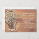 En rustik bröllopsinbjudan med en bild av en masonkruka fylld med vita babykornsblommor på en träbakgrund.