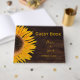 Rustik bröllop country brun trästruktur gul solros middag mottagning gästbok minne. Vacker enkel anpassad tryckt blommig design. Bild upphovsrätt Marg Seregelyi Photography.
