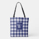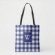Den här skorpa tote-väskan har en blå och vit mönster buffel. Anpassa din monogrammatiska inledning i vit typografi i blått. Gör en unik gåva!