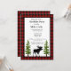 Denna rustika röda och svarta buffelrutiga designade inbjudan är perfekt för honom. Designen har även granar och en siluett av en älg.
