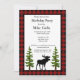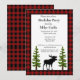 Denna rustika röda och svarta buffelrutiga designade inbjudan är perfekt för honom. Designen har även granar och en silhuett av en älg.