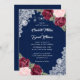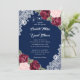 Anpassningsbar Rustic navy blue, burgundy och bröllopsinbjudning med ro och baby utandning mot en sammanbrott och snöre-bakgrund som dekoreras med sträng ljus. Bröllop-detaljer skrivs i ett modernt skript med snyggt.